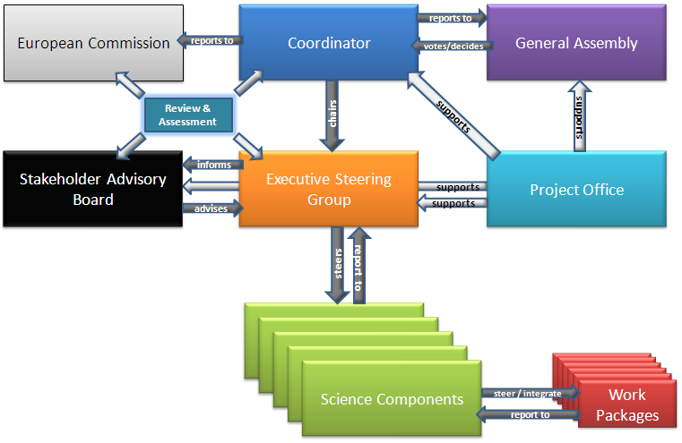 ECLAIRE contains four core management bodies to direct and support the Science Components and Work Packages. The relationships between these are summarized in the Figure below: